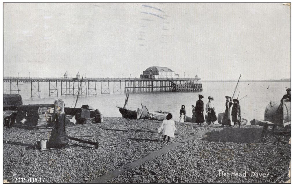 Most vintage postcards date from the first decade of the twentieth century – the age of the postcard collecting boom when hundreds of thousands of cards were sent, received, and carefully added to postcard albums. Many cards were still sent during the next two decades, but by then the collecting hobby had subsided and consequently far fewer of them have survived. My eighth chance purchase at an antique fair is one of these later cards having been posted in 1917. Having said that, the photograph of Pier Head Dover must be from fifteen or twenty years earlier, depicting a calmer, more peaceful Edwardian era. By the time this card was sent, the pier had been taken over by the Admiralty and heavily fortified.