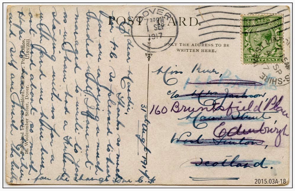 CF paints a peaceful enough scene. Friends have been to stay and they have been out and about. Maudie and her mother have also had a bit of a rest and, it would appear from the amended and forwarded address, they had been moving around Scotland. The card was posted on the 1st but wasn’t redirected until the 4th of September so we can assume that Maudie didn’t receive it until the 5th at the earliest. By that time there had been one of the heaviest night air raids of the First World War over Kent and over 150 people had been killed in the bombing. With luck, poor Maudie and her mother were safe and sound in Scotland, otherwise they wouldn’t have been any better for the rest.