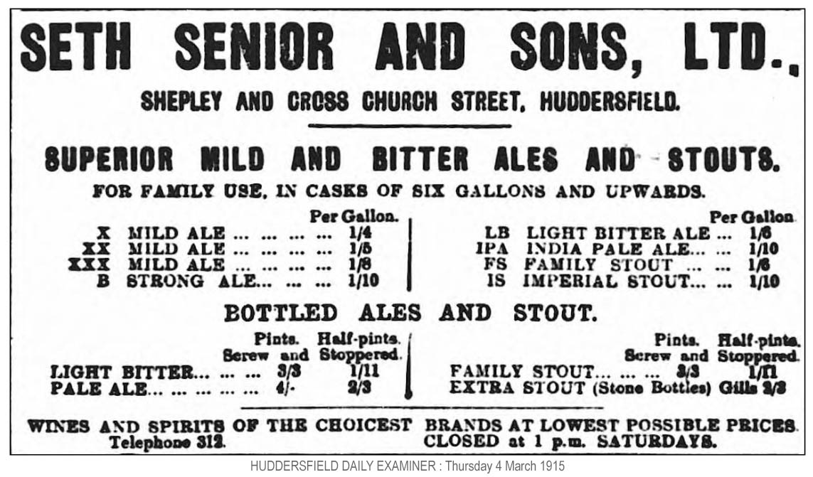 I saw this advert in the Huddersfield Examiner and it seems like a bit of a bargain to me. Whilst the bottled Pale Ale seems to be selling at 4/- a pint (that is four shillings or 20p to those who are too young to be reading this blog), the cask conditioned India Pale Ale is selling at 1/10 per gallon (that is one shilling and ten pence or …..err ….. well not very much). Now I have just wasted a half hour of my time this evening (that is 30 minutes in new time) taking a load of beer bottles to the bottle bank. I would have been far better buying a few gallon of Seth Senior’s IPA and decanting it into my empty bottles. What a shame that the newspaper is a little out of date.