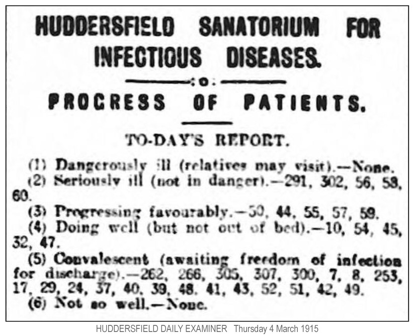From the same old newspaper I find a short article detailing the progress of patients in the Huddersfield Sanatorium For Infectious Diseases. Back in the days before telephones were widespread and when private cars were a rarity, it was a problem checking on the progress of a relative confined to the Fever Hospital. The printing of brief prognoses followed by a list of individual patient numbers was quite a clever way of informing those who needed to know whilst preserving an element of patient confidentiality. This system of bulletins published in local newspapers continued well into the second half of the twentieth century, I can recall seeing such lists in the papers when I was young (which was a long time ago).