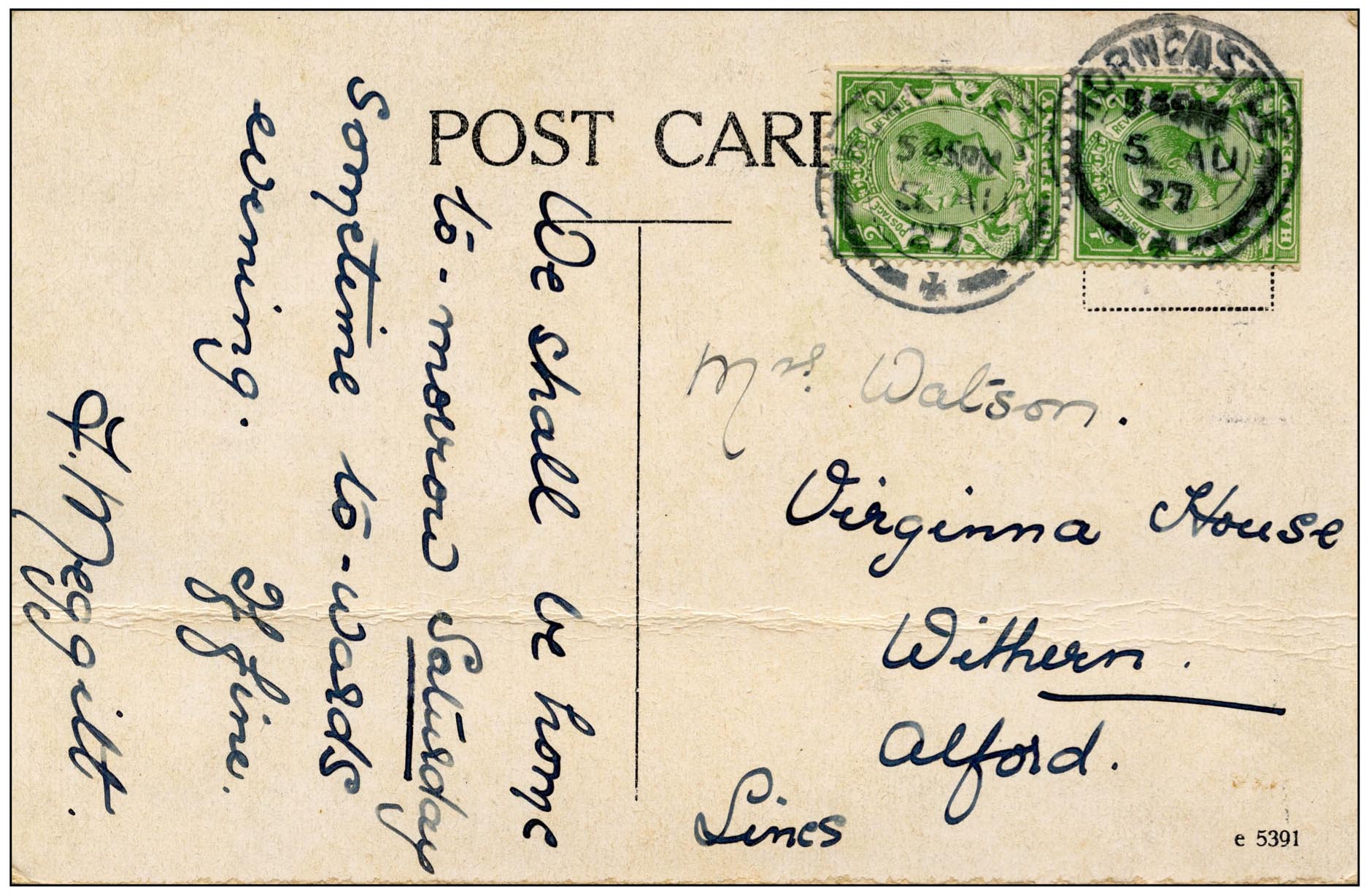 One final little connection to note is that the card is being sent to Mrs Watson at Virginia House. There are all sorts of ties and connections between this little sleepy part of Lincolnshire and Virginia in the United States. Captain John Smith – the same John Smith who established the Jamestown settlement and was later saved by the love of Pocahontas – grew up in Alford and the great political philosopher Tom Paine – author of The Rights of Man – was briefly an excise officer in the town.