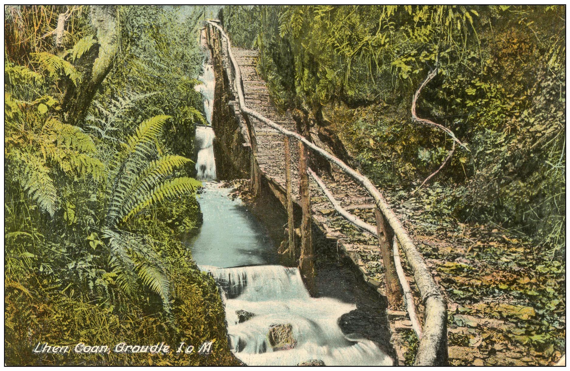 This picture postcard was sent in 1927, but I suspect that the photograph dates from the end of the nineteenth century. It shows a somewhat precarious pathway over a stream and is entitled “Lhen Coan, Groudle, I of M” The “I o M” part is easy for anyone from the UK to interpret, it is the Isle of Man: that curious outcrop in the middle of the Irish Sea which seems for ever unsure as to whether it is part of Britain or indeed part of the twenty-first century. Mr Wiki Pedia tells me that Lhen Coan is not an elderly Canadian singer of sad but beautiful songs, but the Isle of Man’s only natural canyon which is situated in Groudle Glen which is on the east coast of the island. Groudle Glen has a fascinating history and at the time of the postcard it boasted a zoo, a railway, an open-air dance floor and a variety of entertainments. Lhen Coan (which in Manx Gaelic means “Lonely Valley”) was a place you could take a quiet walk when you were tired of the bright lights of Groudle Glen, and you could explore the peaceful little valley by means of the rustic pathways. The pathways have now fallen into disrepair and the zoo and the dancing are long gone, so once again Lhen Coan can live up to its name.
