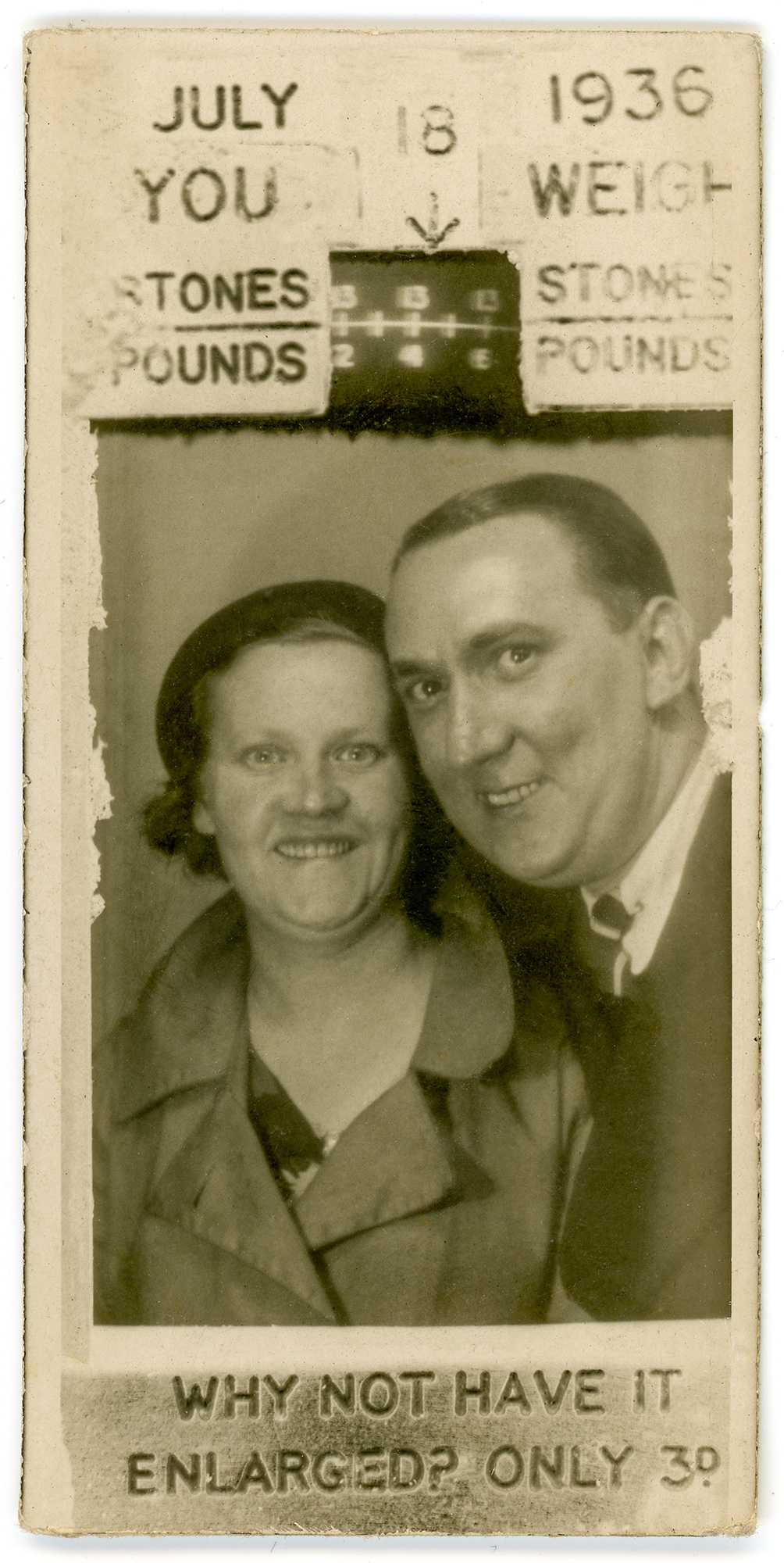 What a wonderful invention: a machine that takes your photograph and weighs you at the same time. And even better – it prints the resulting weight on the photograph so that you have something to remind you of that day you had an extra large portion of fish and chips, not to mention the knickerbocker glory. And if that isn’t enough, you can have the whole experienced enlarged for an extra three pence. There can only be one thing better: get you nephew to scan the photograph eighty two years later and put it on the internet for all the world to see.