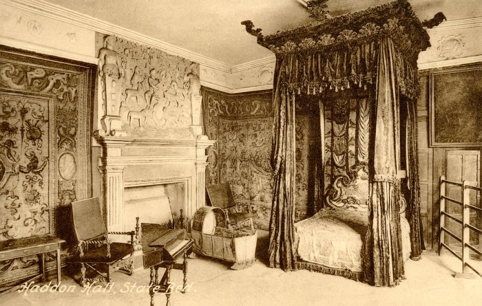 This week he found a picture of a bedroom and in order to come up with a half suitable match, an awful lot of digging was necessary. The best I could find was an old vintage picture postcard of the State Bed at Haddon Hall in Derbyshire. It is a good deal grander than the bed in the theme image, but, a bed is a bed.