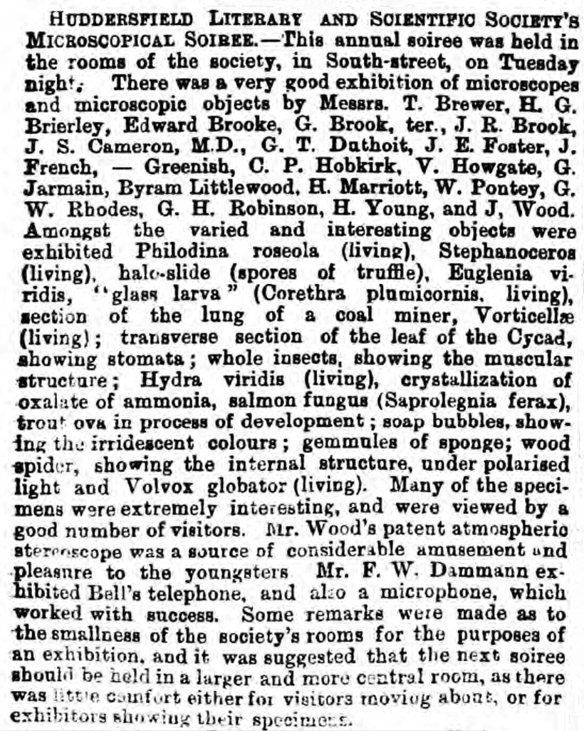This description of a meeting of the Huddersfield Literary and Scientific Society’s “Microscopical Soiree” is taken from a copy of the Huddersfield Chronicle of the 9th January 1879 – 140 years ago. Old newspaper articles can paint pictures just as well as any art school graduate, and as you read through the list of microscopic treats on offer – spores of a truffle, trout’s ova, section through a coal miners’ lung – you begin to picture a body of frock-coated, heavy bearded Victorian gents fussing over the specimens and speculating about the future of mankind. The youngsters are deriving considerable amusement from Mr Wood’s patent atmospheric stereoscope, and the women – one presumes – are at home supervising the scullery maid.