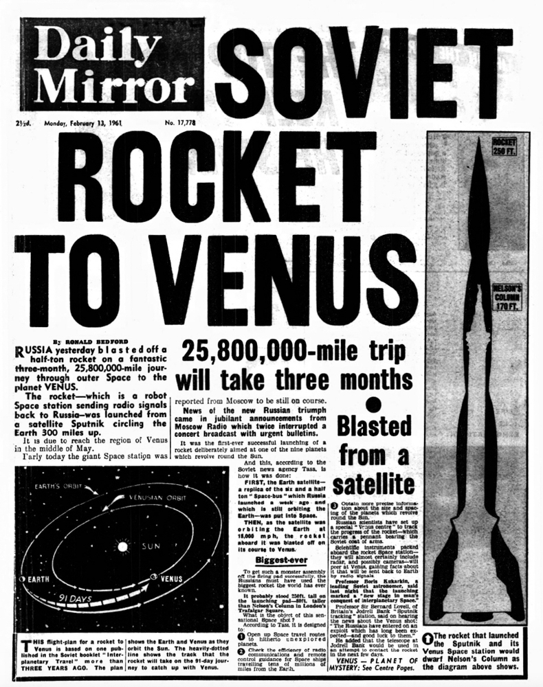 Today, our random number generated time machine is a rocket. 58 years ago today, the papers were full of the latest Soviet achievements in space. There is evidence that the spaceship – Venera 1 – did manage to fly past Venus, but sadly all communications were lost within a week of the launch, so we will never know what it found there.