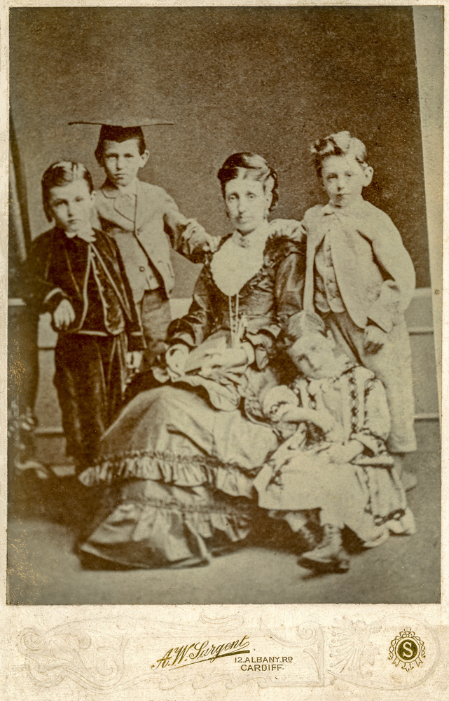 On the reverse of this Victorian Cabinet Card is written the following: “My Grandmother (Susanna), Dad in black velvet suit, Uncle Dewi next, Uncle Arthur on his Mother’s left, Uncle Tom leaning against her”. As so often with these Victorian studio cards, I have no idea who all these people are, and there is something rather sad about the fact that the photograph is in my collection rather than gracing the mantelpiece of one of Susanna’s relatives. The photograph comes from the studio of A. W. Sargent of Cardiff. If there is anyone out there who wants to claim these people as their own, just get in touch and I will be happy to re-unite them with their family.