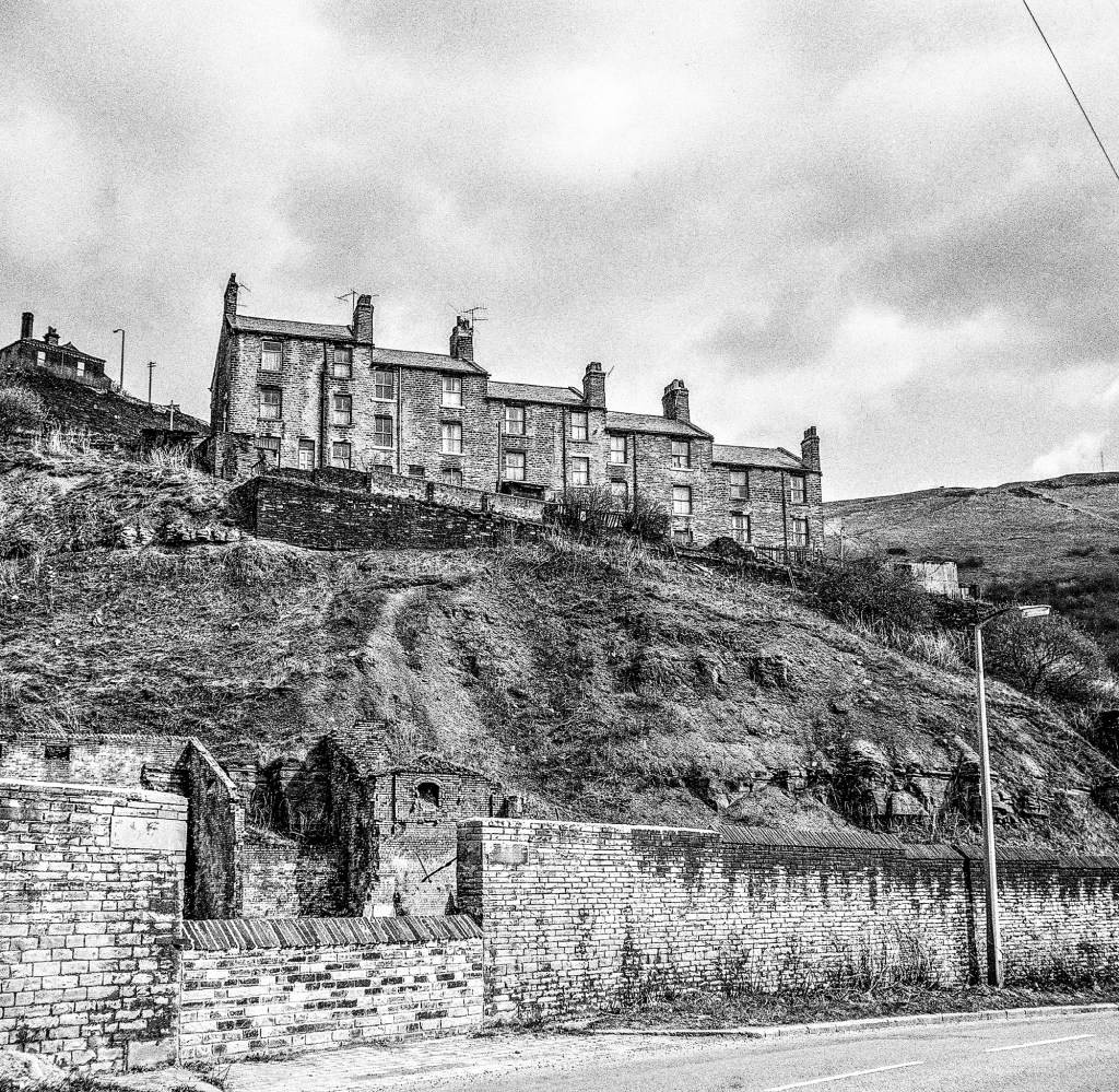 Houses that are superglued to the hillside: two storeys at the front, three at the back. From the top window you could see all the way to Wainhouse Tower – if it wasn’t for the mills in between.