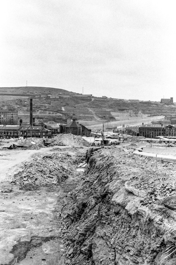 It is difficult to appreciate the scale of the construction of Burdock Way in Halifax from a modern perspective: new buildings have taken root, trees have filled the empty spaces, the highway has “bedded-in” to the local scenery. I must have taken this photograph in 1970, when construction had just started, and you almost get the feeling of a great river of molten lava flowing down from Beacon Hill had destroying everything in its course. This is not an “old man complaining about change” post, however: I think Burdock Way was a brave and a forward-thinking project, which still has elements of structural beauty about it. Nevertheless, it is interesting to let your eye wander around the image, catching sight of that which was, but is no more.