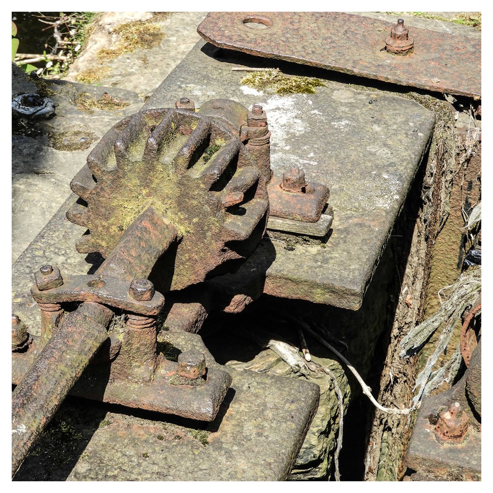This old paddle mechanism is on the route of the Halifax Arm of the Calder and Hebble Canal. The canal arm has been closed for over eighty years, but the paddle mechanism still rusts in the Yorkshire sun, waiting its turn.