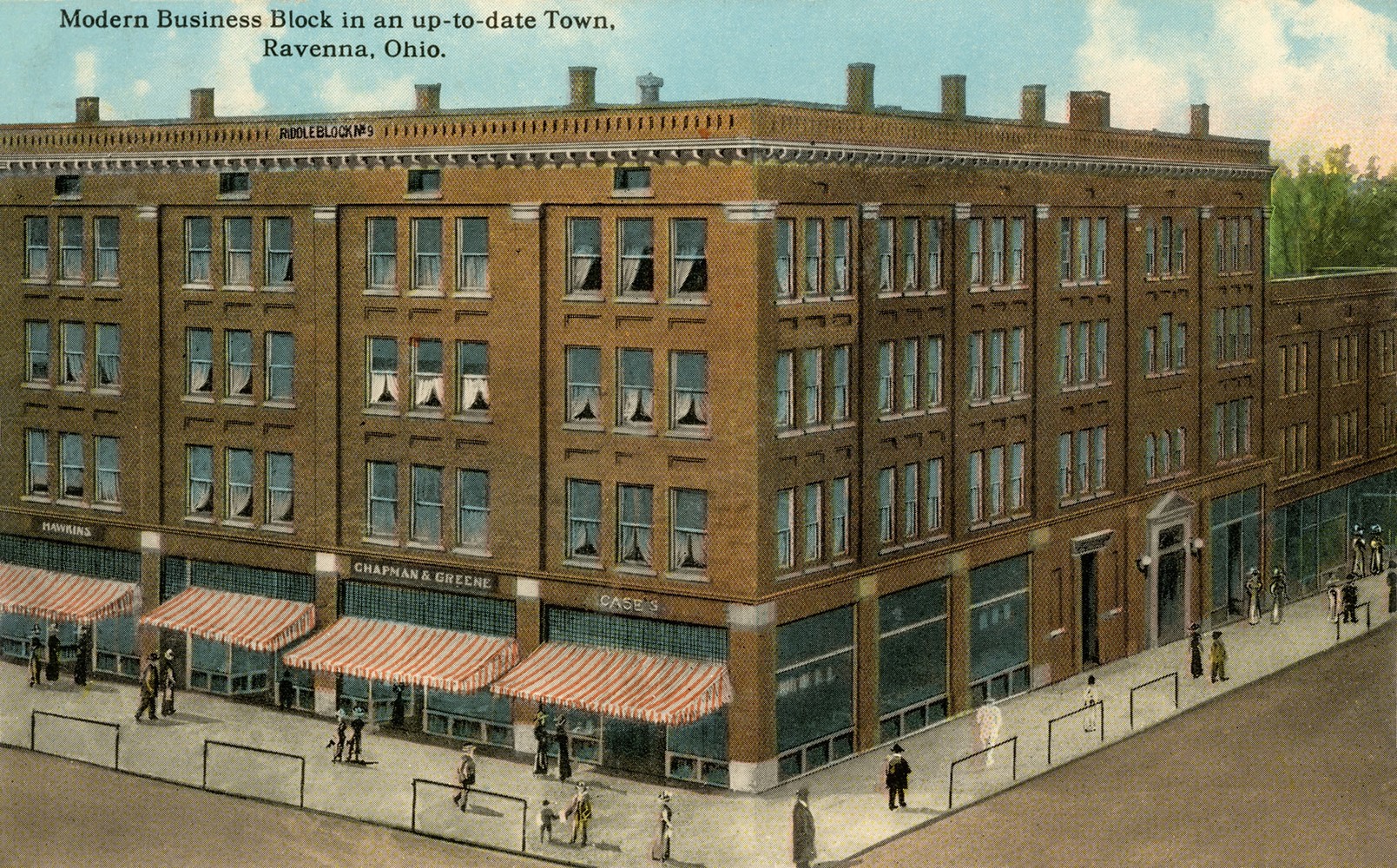 Back in the days when picture postcards were all the rage and the demand for colour photographs outstripped the technological ability to be able to deliver them, monochrome photographs were hand coloured. Most were done with skill and care, but occasionally short cuts were taken. It was nearly going-home time and the weekend was just around the corner. It was just a photograph of a “modern business block” in Ravenna, Ohio. Surely nobody would ever notice the walking man with the blue spots.