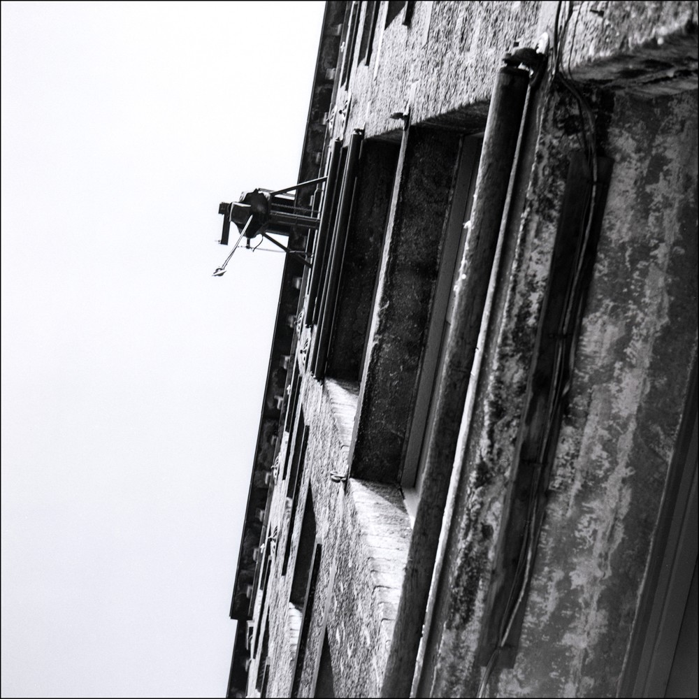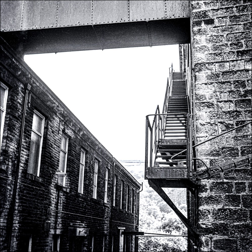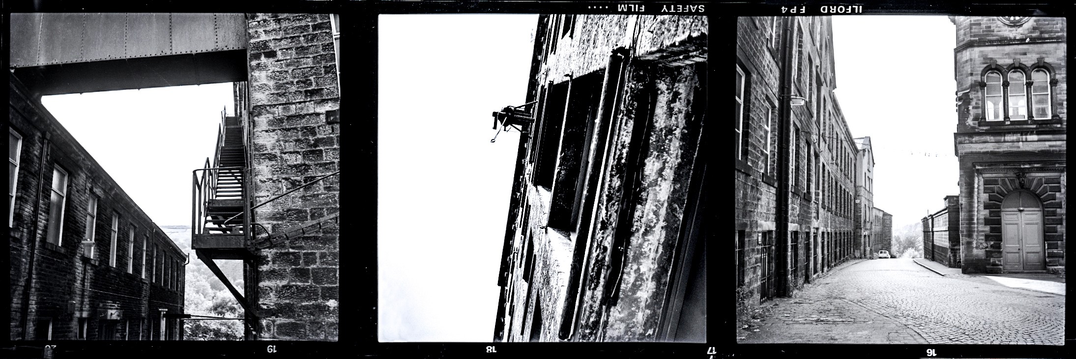 A strip of medium format negatives dating from the 1980s is the next to go on my scanning machine. I took these photographs whilst on a walk down Shaw Lane in Halifax, at a time of transition for the town. The last of the mills that had been at the heart of the economic and social life of the town for the previous one hundred and fifty years were closing down and there was an almost desolate feel to parts of the town: streets were empty, building abandoned – almost as if life had moved out and moved on. The soot – that preserved footprint of the industrial revolution – still coated the stone walls and chimneys of the dark forgotten mills.