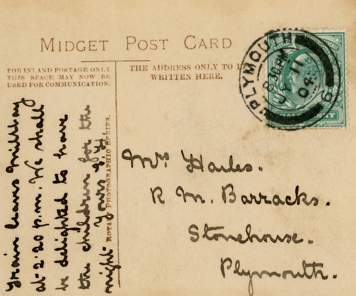 This particular tiny postcard was sent to Mrs Hailes of the Royal Marine Barracks in Stonehouse, Plymouth in July 1904. The message is short and to the point (they had to be on midget postcards – a little like Twitter you were restricted in the number of characters you could use! “Train leaves Millbay at 2.20pm. We shall be delighted to have the children for the night, EH.”