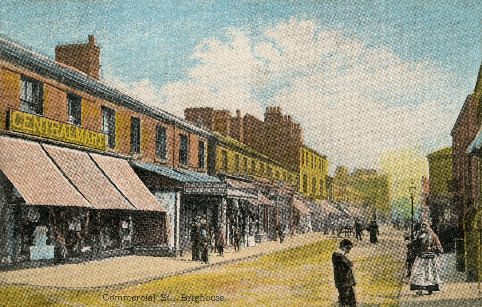 This early twentieth century postcard of Commercial Street in Brighouse is a particularly good example of the tinter’s art, with its too blue sky and its mustard coloured streets. The buildings are real enough, however, and a walk down Commercial Street today would reveal most of these nineteenth century shops still in place: although the original owners have long left the scene. Thomas Clayton’s Central Mart was Brighouse’s equivalent of a department store, where you could buy everything from knicker elastic to linoleum. Think of it as an Amazon of the High Street.