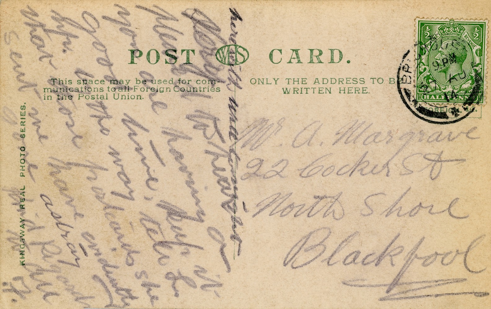 The card was sent in August 1914, just a few weeks after the outbreak of World War 1 (although there is no mention of the conflict in the message). It was sent to a Mrs Margrave of 22 Cocker Street, Blackpool, from someone who signs themselves as :F”. The message is as follows:-