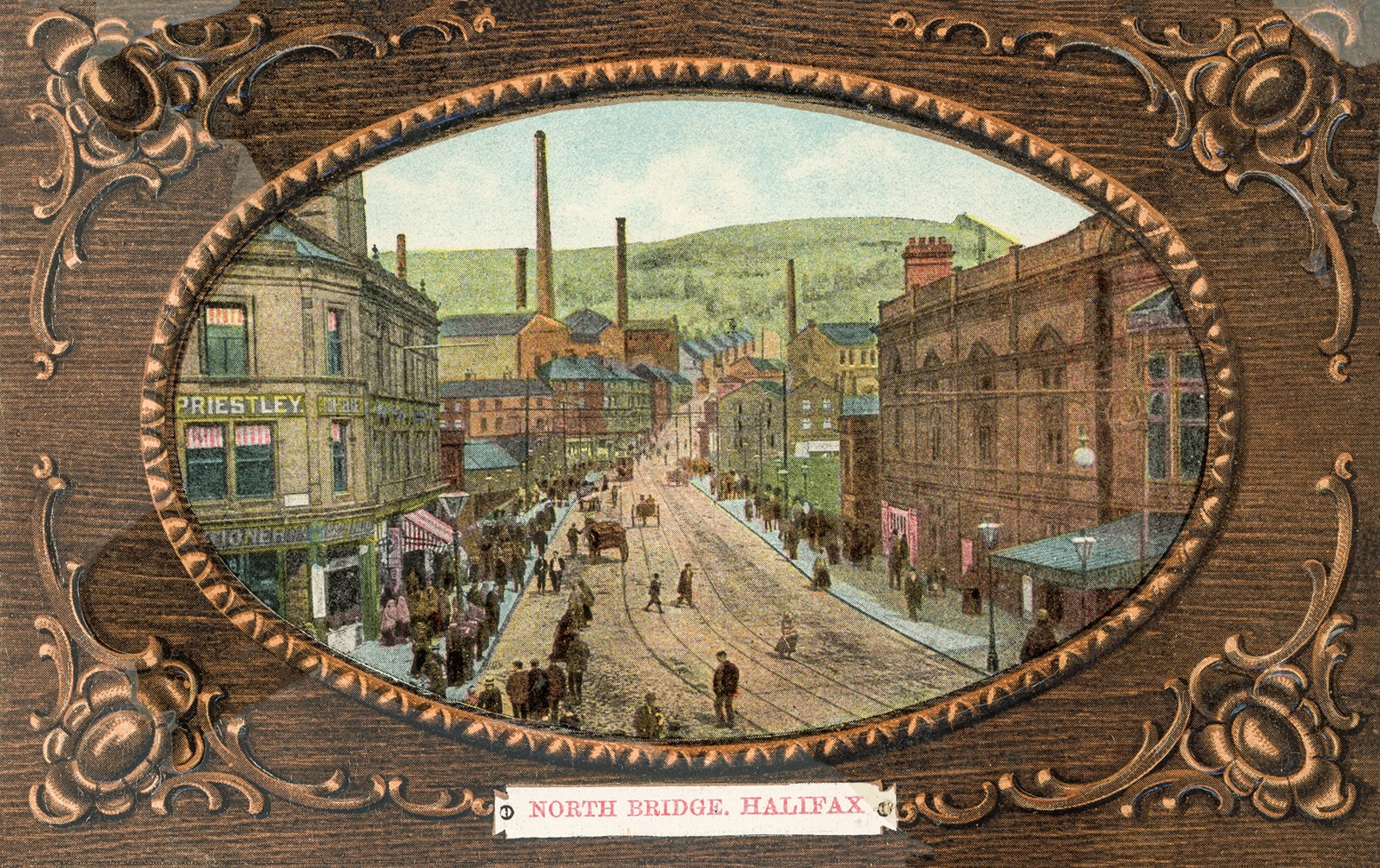 A vintage postcard of North Bridge, in Halifax, back in the days when it was the main route out of town to the north. Back then, the buildings hugged the side of the road at both ends of the bridge, and it did not have to live under the concrete shadow of the Burdock Way overpass. People streamed over the bridge, as did trams and horses and carts, on their way to Boothtown, Northowram, Southowram and beyond. The building on the right of the picture is the old Grand Theatre, now sadly gone, but when I started crossing the bridge on a daily basis in the late 1950s, it was still just about there. The buildings on the left still survive, but look lost and a little lonely these days. Practically all of what you can see on the far side of the bridge, was swept away in the construction of Burdock Way and its associated roads and roundabout some fifty years ago. I can just about remember the area as a patchwork of shops, mills, pubs and streets of terraced houses.