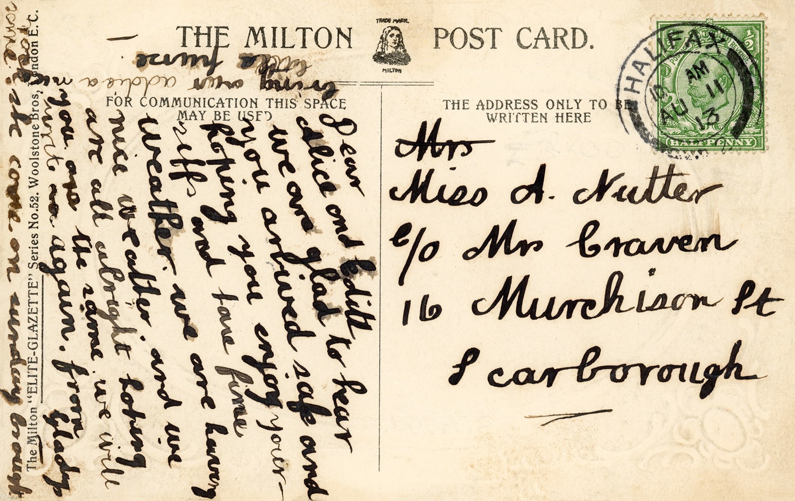 This particular postcard was posted in 1913, although the photograph probably dates from ten years earlier. The card was sent to Alice and Edith Nutter from their friend Gladys, and is full for the inconsequential chatter that is now the stuff of text messages. Undoubtedly, text messages are cheaper and quicker to reach their destination. But who will look at a text message in one hundred years time and see a picture of Halifax that no longer exists?