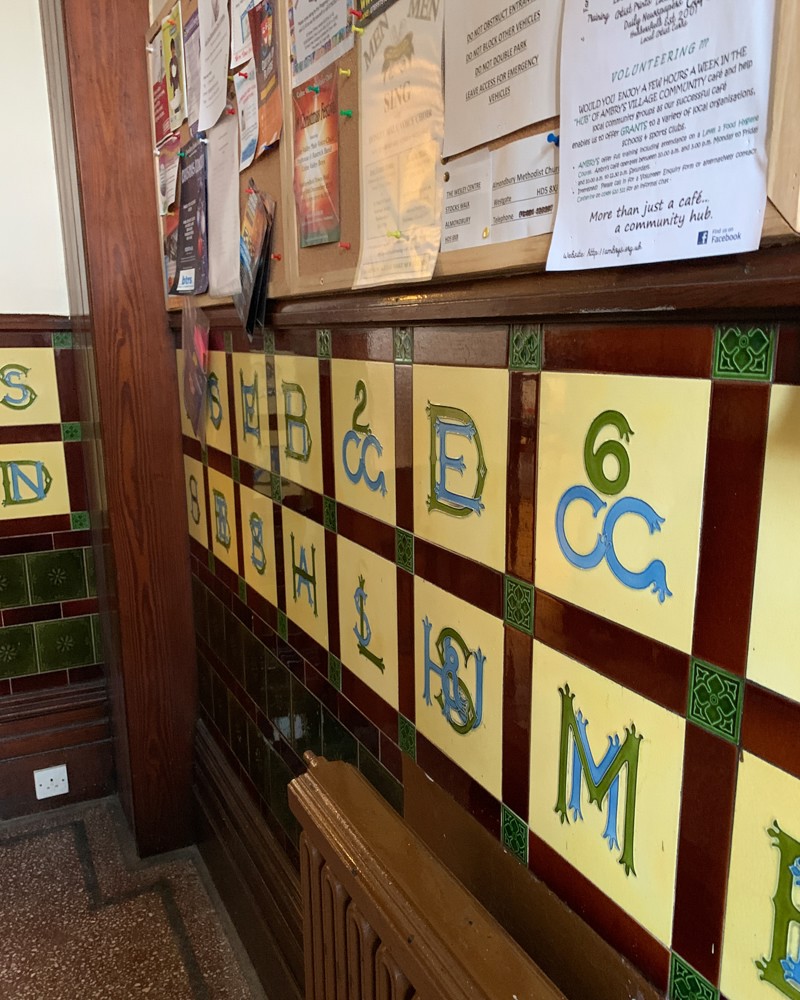 For years I have been fascinated by the decorative tiles in the entrance hall to Wesley Hall in Almondbury, near Huddersfield. They were, no doubt, a memorial to the founders of the church – now they are also a memorial to decorative style.