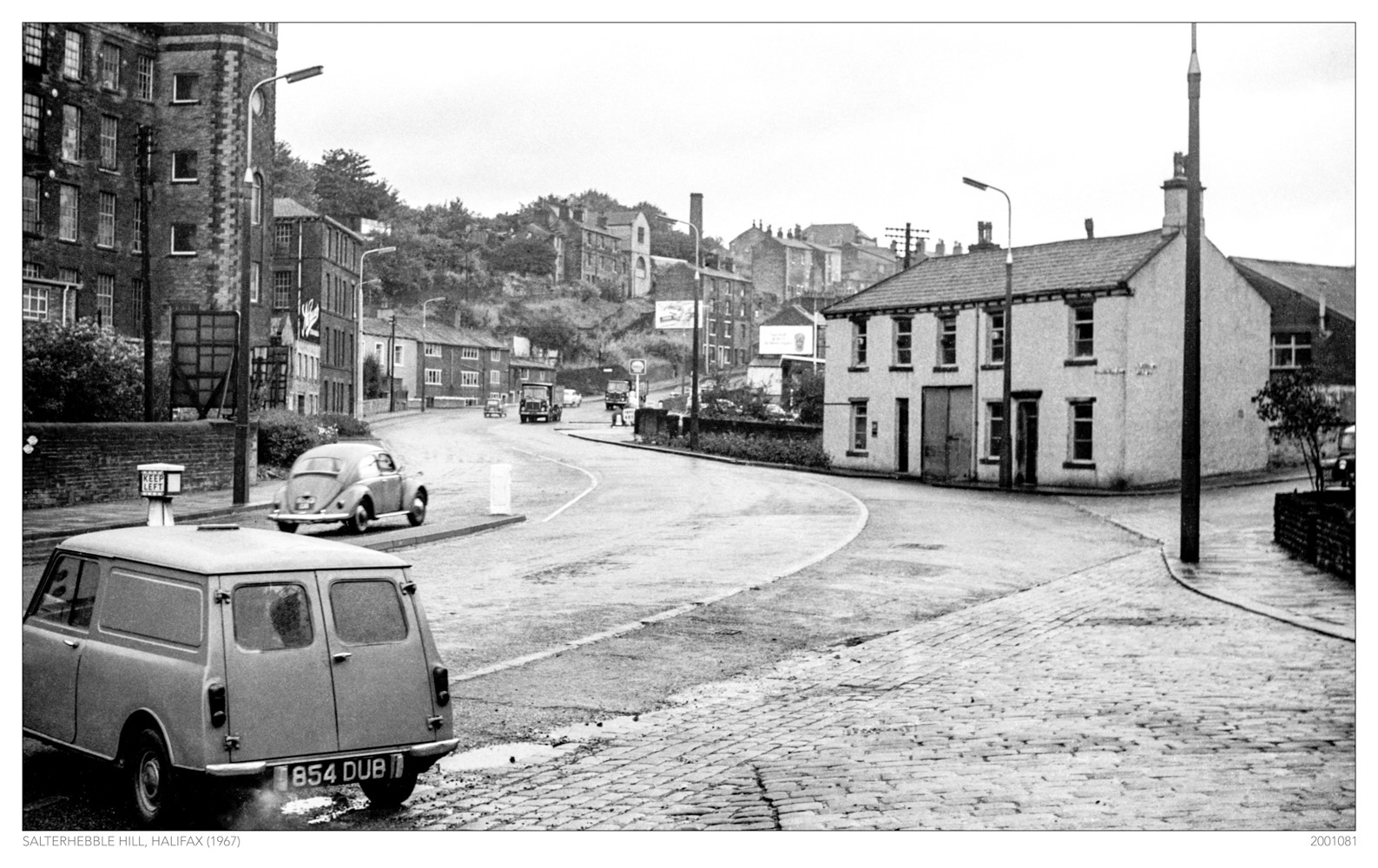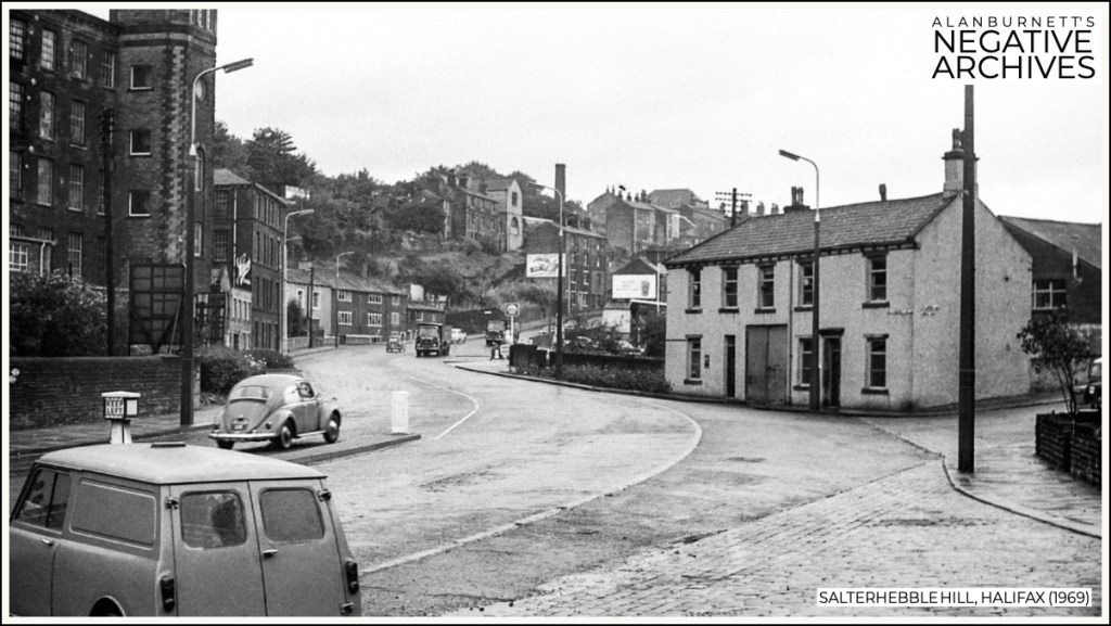 I took this photograph of Salterhebble Hill in Halifax in the late 1960s for someone who wanted it as evidence in claim for compensation following an accident. Looking at it now, it is fascinating to see long-forgotten buildings such as Nahum’s Union Mill standing where the Water Mill pub and restaurant now stands. This area is undergoing more changes at this current time as part of the road widening scheme.