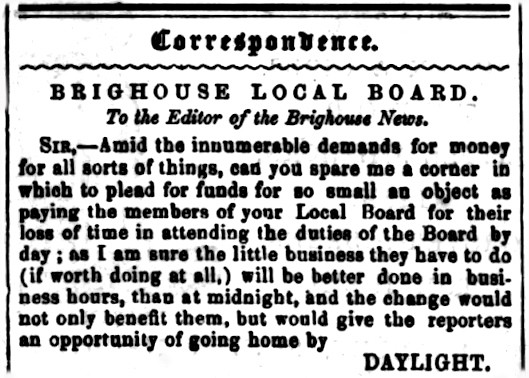 BRIGHOUSE LOCAL BOARD To the Editor of the Brighouse News SIR, Amid the innumerable demands for money for all sorts of things, can you spare me a corner in which to plead for funds for so small an object as paying the members of your Local Board by day; as I am sure the little business they have to do (if worth doing at all) will be better done in business hours, than at midnight, and the change would not only benefit them, but would give the reporters an opportunity of going home by DAYLIGHT