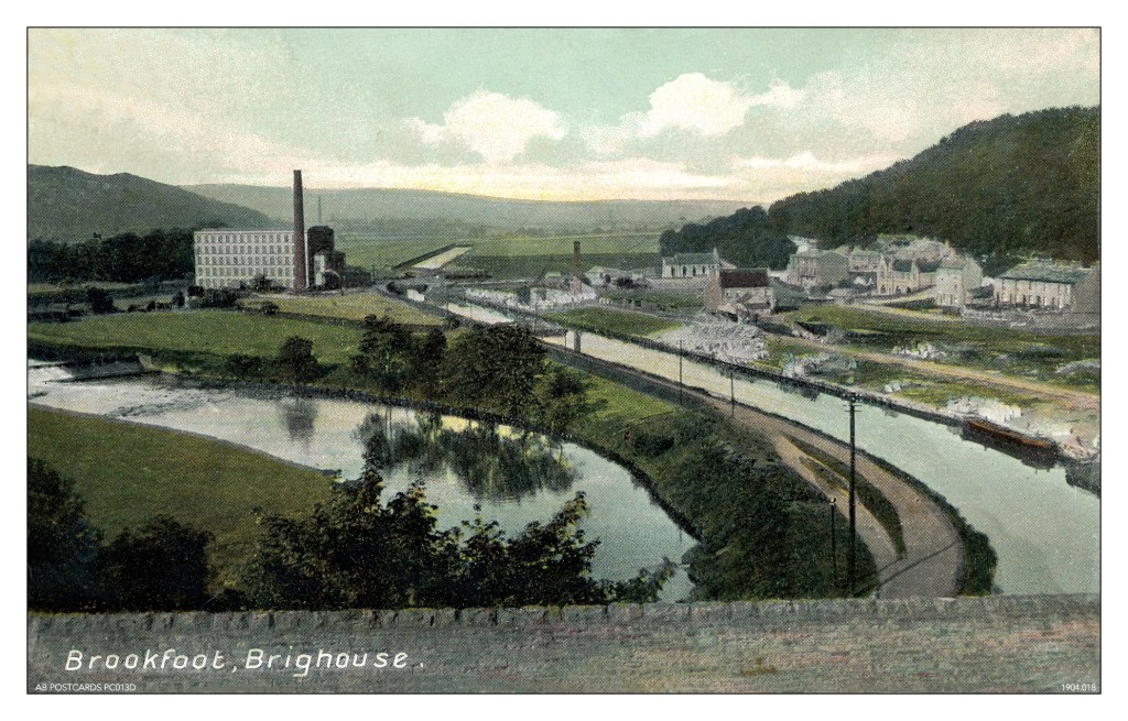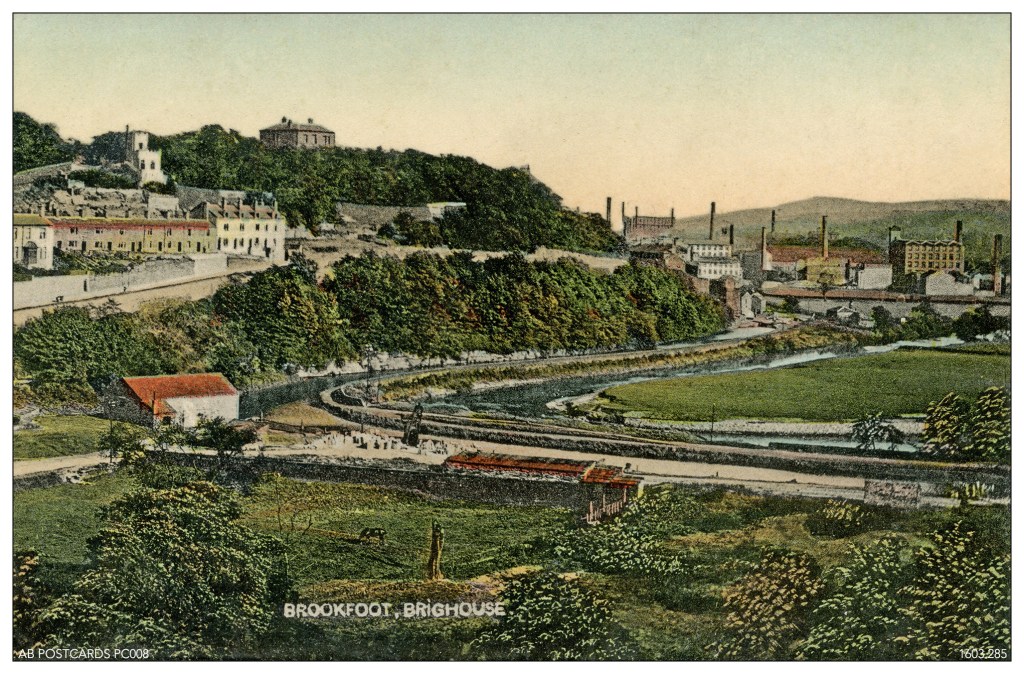 After publishing one of my old vintage postcards of Brookfoot – which is little more than a bend in the river a mile or so west of Brighouse – on a Facebook local history site, I started a trawl through my collection to see if I had any more postcards featuring the same spot. I was delighted – and somewhat surprised – to discover I had three: a Brookfoot triptych! During the great postcard boom years, local photographers and publishers were combing the glens and bends of the country, looking for subject matter, and even tiny hamlets like Brookfoot had their five minutes of pictorial fame. Or, in the case of Brookfoot, fifteen minutes!