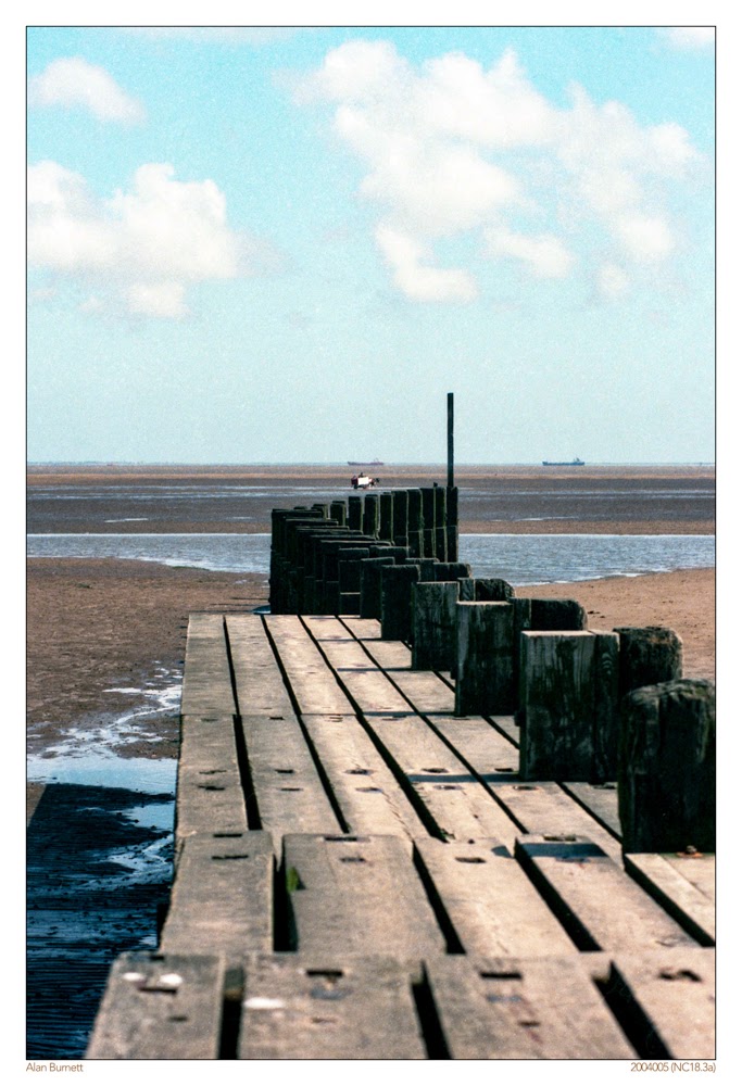CLEETHORPES : The mud-like sands at Cleethorpes. The line of container ships waiting their turn to sail up the Humber to unload at Immingham. The wooden pier with planks that look as if they have been made of fish-boxes.