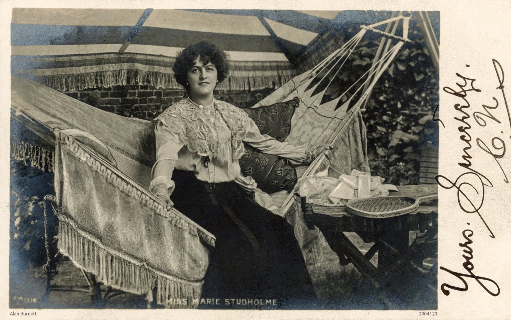 This is a rather strange picture postcard featuring the Victorian and Edwardian entertainer, Marie Studholme. The photograph is fetching enough: she sits suspended in a hammock next to a table bearing a tennis racket. The table, however, also contains a basket full f some strange unidentified objects that look rather like a cross between a modern polythene-wrapped sandwich and a folded pocket handkerchief.