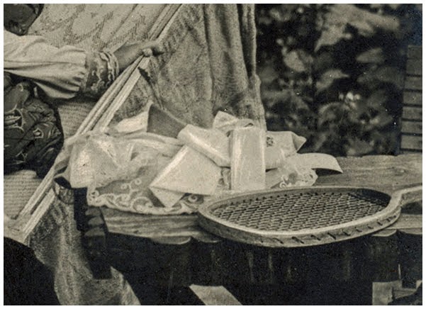 Don’t know what’s in the basket – looks like fabric. Perhaps hairbands to keep the hair back during tennis, or maybe serviettes for tea after the game? Probably just props.
