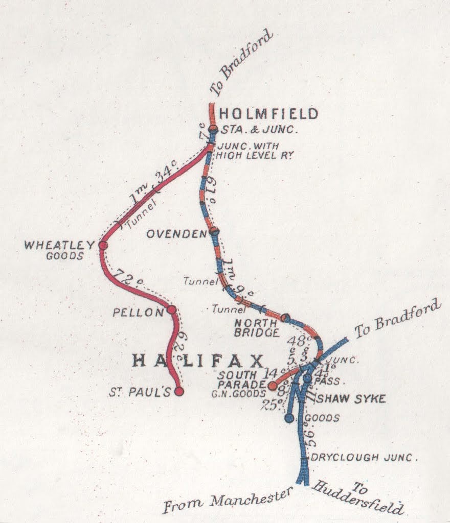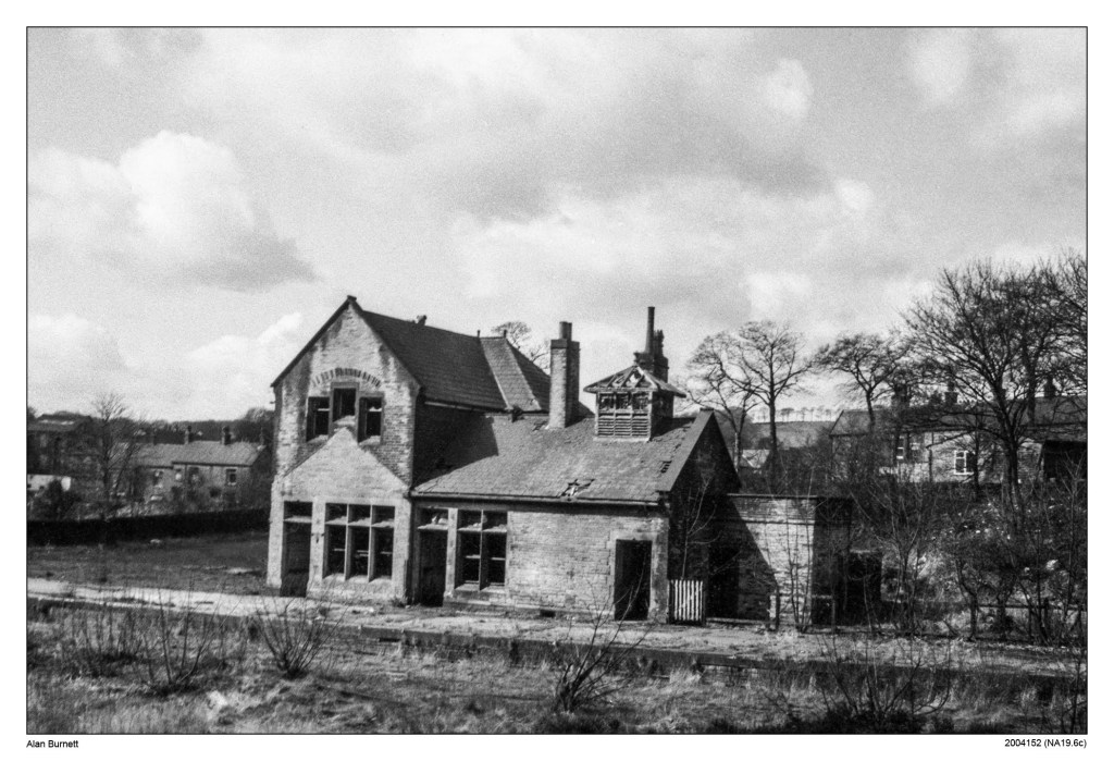 Holmfield railway station was opened by the Great Northern Railway in 1878. For a short while it was the terminus of the branch line leading to Bradford via Queensbury, until the line was completed to Halifax, via Ovenden, a year later. It became a junction when the Halifax High Level line was built to St Pauls in 1890. It was closed to traffic in 1960 and demolished sometime after I took this picture in the late 1960s / early 1970s.