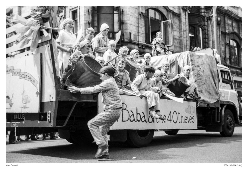 The floats wind their way through the centre of Halifax, and half-familiar buildings provide a backdrop to a series of animated displays. The subjects reflect the cultural hotpot that was the middle of the twentieth century: some look back at familiar nursery rhymes, some look forward to the television shows that were increasingly dominating our lives.