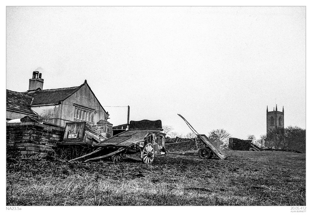 I am almost certain that the first shows the tower of Coley Church, brooding in the background, slightly aloof then – and now – from everything that goes on around it. I think, but can’t be certain, that the building with the carts is Sowood House at the bottom of Coley Lane. You could probably take exactly the same scene in 2020 and little will have structurally changed: the house still stands, the church tower can still be seen in the background. You could turn the digital image into monochrome, you could apply every Photoshop ageing filter in your package: you could scratch it, add dust to it, tire it, and fade it. And yet, you would not be able to make it feel as old as this image. Quite clearly, it was taken in my lifetime (I took it!), but it is another age, it has the feel of history.
