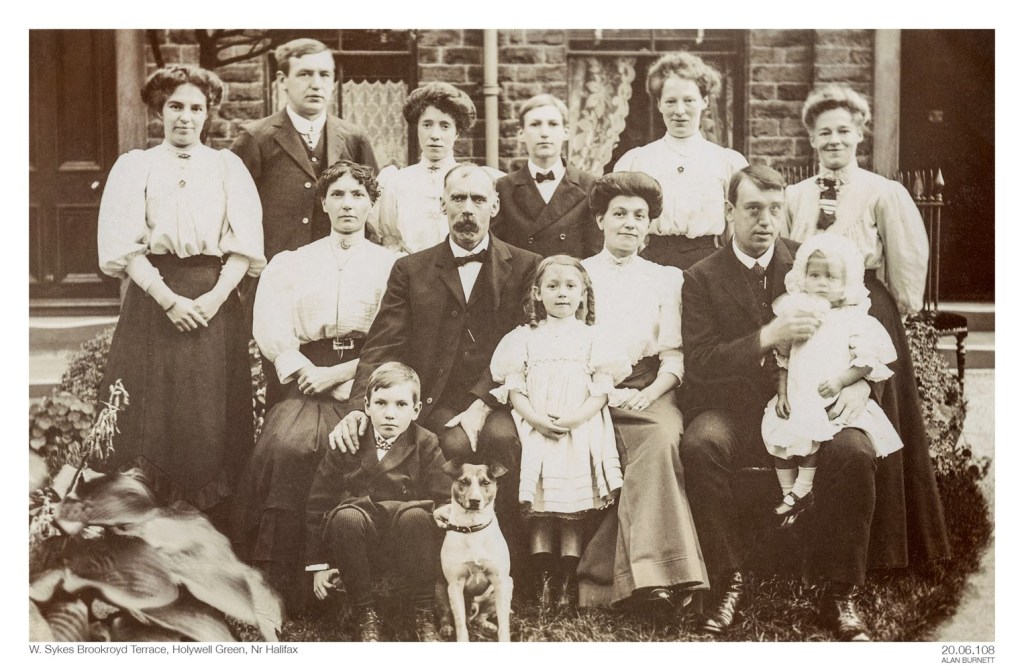 I acquired this old photograph a couple of weeks ago. It’s a rather fine photograph of a large Edwardian family posing outside a terraced house. My interest in it was sparked in particular, by the address printed on the reverse – like so many photos of that era it was printed as a postcard – which was W. Sykes, Brookroyd Terrace, Holywell Green, Nr Halifax.