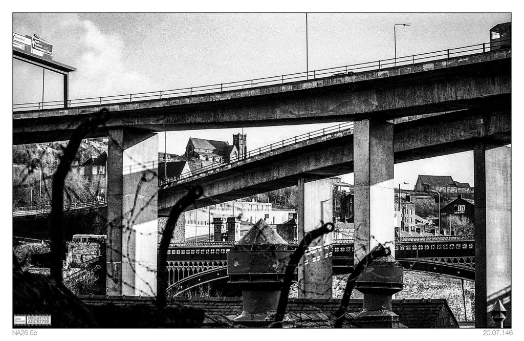 I think I must have taken this photograph in the 1980s, which makes it rather late in my black and white days. By then the Burdock Way overpass had become part of the very body of Halifax; a vital artery rather than a varicose vein. Key buildings had shifted their positions to benefit from its’ fine concrete picture frames.