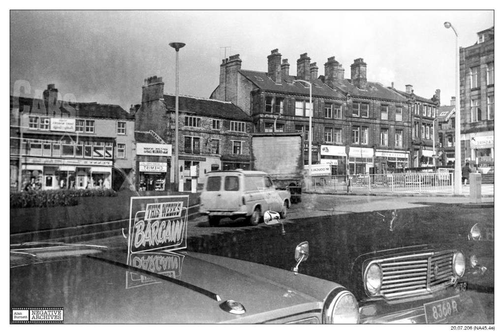 Here’s a little challenge for you nostalgia lovers. I must have taken this photograph of Bull Green, Halifax in the 1960s, so you can have fun trying to spot all the shops you can remember. To make it that little more challenging, however, I took the photograph of a reflection of the scene in a car showroom window; so you are seeing everything in reverse. You may recognise DOOWNEERG, the well-known bookshop, or you may be drawn to SNIWEL (but only if you were a man, as women were still banned from there in the 1960s!). Try to work out what was where in this back-to-front world: think of it as a way of exercising your mind, a kind of nostalgic sudoku. If you can’t remember any of the shops, you can always occupy yourself by trying to work out why the cars are going the wrong way around the roundabout!