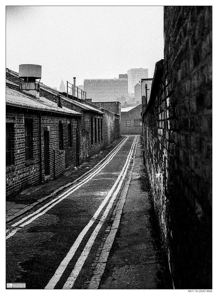 There are enough prominent buildings in the background of this photograph of Sheffield in the 1980s to enable a form of visual triangulation to be used to pin down its location. The problem would be stopping for long enough to set up your theodolite – even in a black and white photo, those look like double yellow lines.