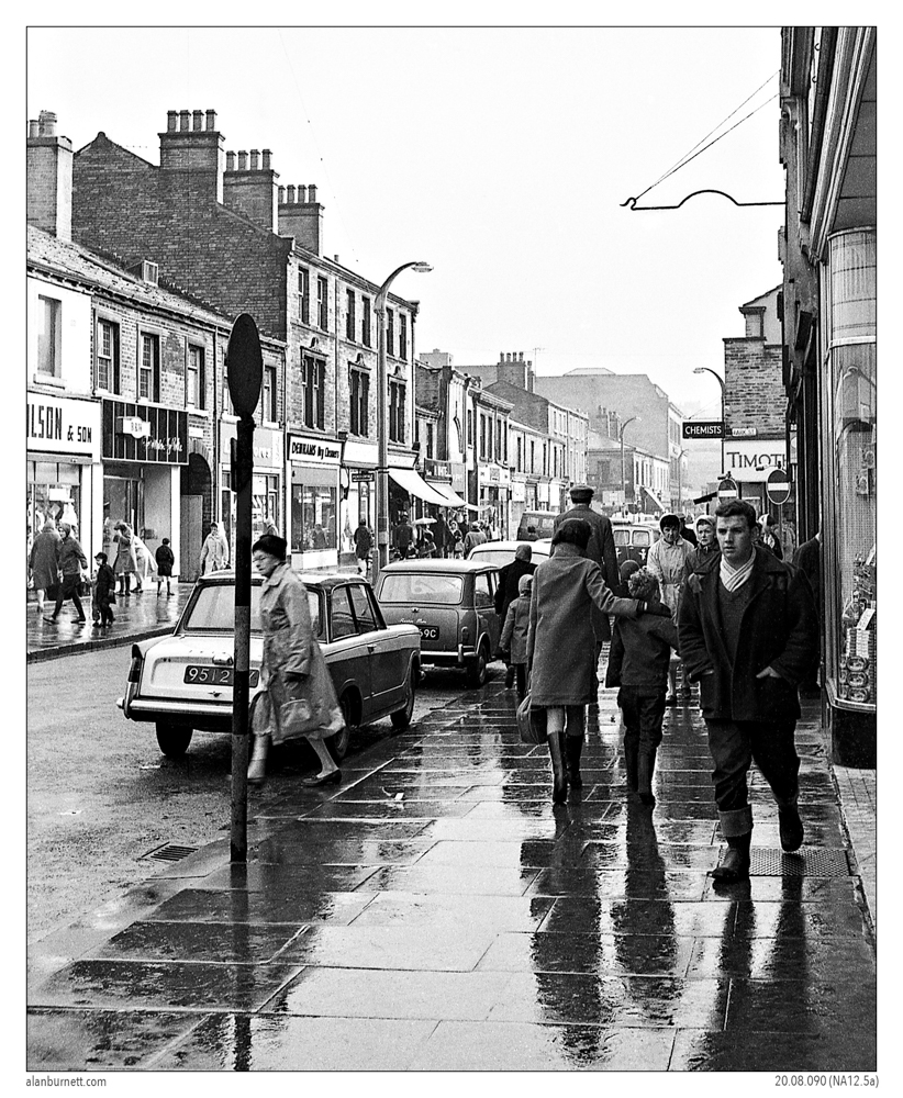 This is a photograph I took in the 1960s of Commercial Street, Brighouse. Looking at it again as it emerges from the negative scanning machine, I am struck by the changes. Not the physical changes – the buildings are just about the same as they were fifty years ago; Brighouse has been lucky in that way. Sat here, however, in renewed lockdown, I would take the rain, I would take the old cars, the plastic rain hats and donkey jackets: I would take them all gladly, just to have again the crowded streets and carefree activity that was such a part of this scene from half a century ago.