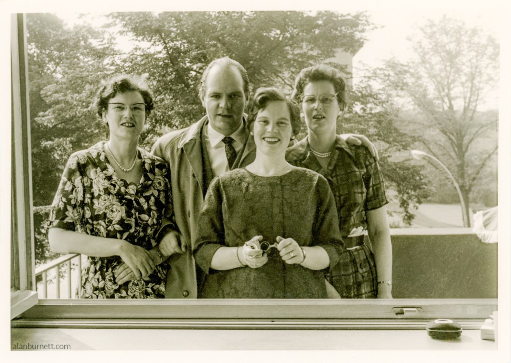 This is quite an unusual shot for a variety of reasons. Let’s forget for a moment who these four people are, and where they were: both are unknown and not massively important in the great scheme of things – especially to the lover of old lost and found photographs. We do have, however, quite a striking image that has been taken through an open window. The four subjects are outside on an open balcony whilst the photographer is inside …. or are they? There is something about the lady in the front and centre of the group that makes me wonder whether she, herself, is the photographer. When you take someone’s photograph – and they are aware of it – there is always an element of the captive visible in the facial expression of the subjects. They have been photographed, a process that has been controlled by someone else. You can see it in three of the faces here, a certain subjugation, a look that quickly reminds you why some people see photography as robbery of the soul. That look is completely absent from the fourth face: she radiates control: if souls are to be collected, then she is doing the collecting. Could the secret of her powers be found in whatever she is holding in her hands? It looks like a piece of optical equipment, could it be some form of remote control device to fire the camera shutter? Perhaps the camera had been set up inside on a tripod, and the group had gone onto the balcony for a photograph taking using a remote shutter release. Get ready, she says, smile, watch the birdie!