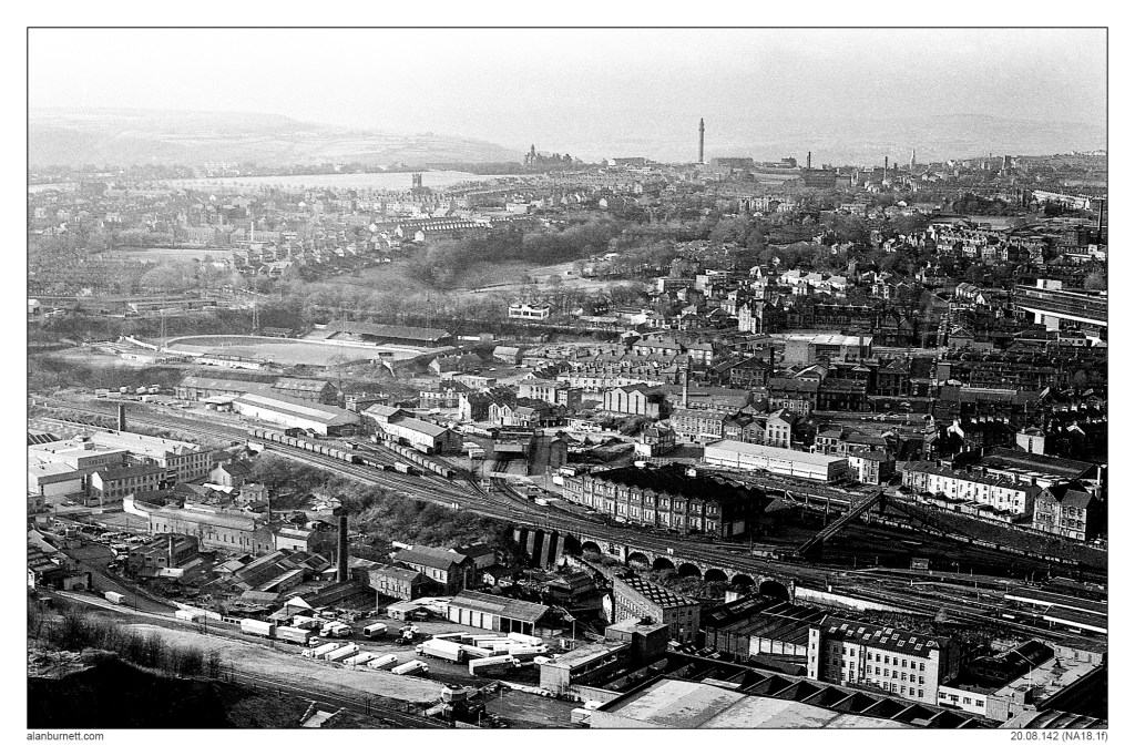 Here is the second of the photographs taken from the top of Beacon Hill, Halifax in the early 1970s. My camera has swung around, so now I am looking in the direction of The Shay and Savile Park. You can just make out the three graces – St Jude’s Church, Crossley Heath and Wainhouse Tower – on the near horizon. Just as with the last of these photographs taken from my “1970s drone” you can focus in on particular areas and see how things have changed in the last half century or so. You can see where houses weren’t and where mills and factories still were. You can see that the Building Society headquarters has made it through the historical cut, but Eureka hasn’t. It is the kind of picture you could set an exam on, write a book about or compose a sonnet to.