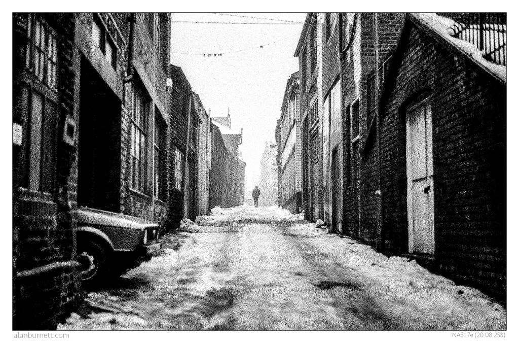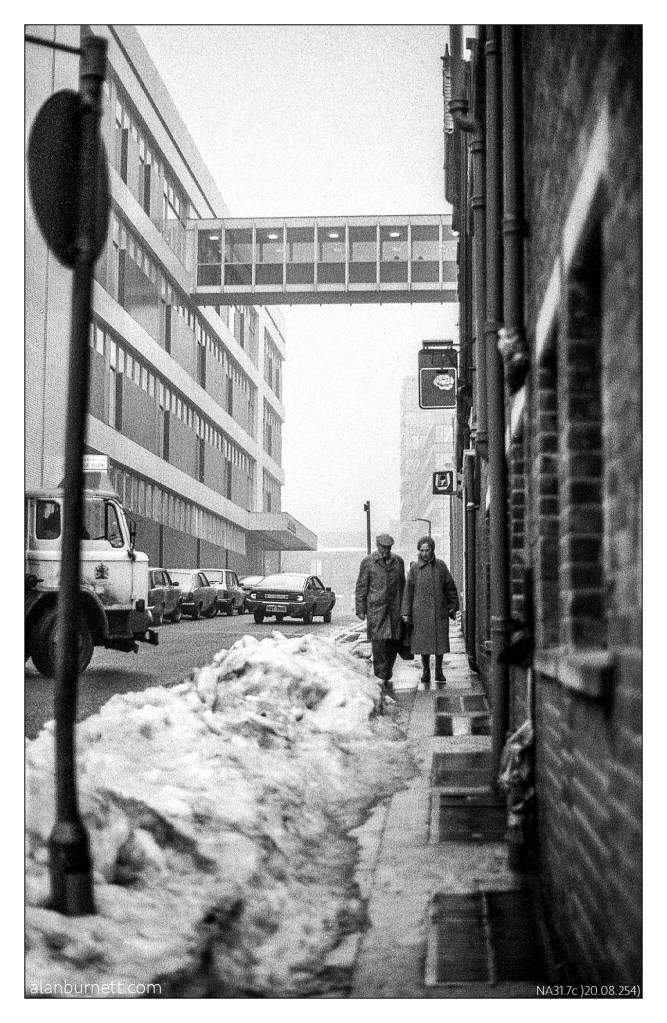 More photographs of Sheffield from the 1980s. Looking back at these old photographs of mine, I can’t help but try to identify what has changed, not so much in terms of buildings, but in terms of the feel and the atmosphere. These grainy black and white images are responsible for a lot of the perceived change: just as our real memories fade, our photographic memories loose colour and definition. Although there are plenty of people on the streets – despite the weather – there is also an element of emptiness – the scenes have been drained of objects, leaving only the dirty snow drifts, the misty lines of buildings and the unmistakeable shape of 1980s cars. We can also pick up detailed clues to change: shops that have long gone, services for machines that no longer exist. The photographs are full of steel city snow mixed with a generous helping of grainy nostalgia.