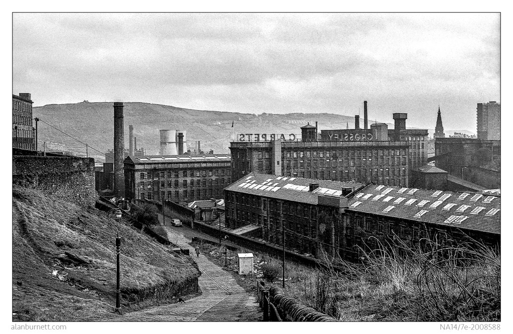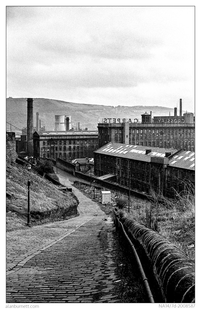 This cobbled way which runs from Old Lane up to Woodside in Halifax, is popularly known as Donkey Hill, although you will probably have difficulty finding that name used on any official map. Countless generations of Halifax folk have memories of sledging down the steep hill as children in winters, and early morning walks to work as adults. It still exists, although now it is heavily overgrown and rubbish-strewn. I took these two photographs back in the late 1960s – or possibly early 70s – when the mills were still weaving and the barren Beacon Hill still cast a shadow over the monochrome town.