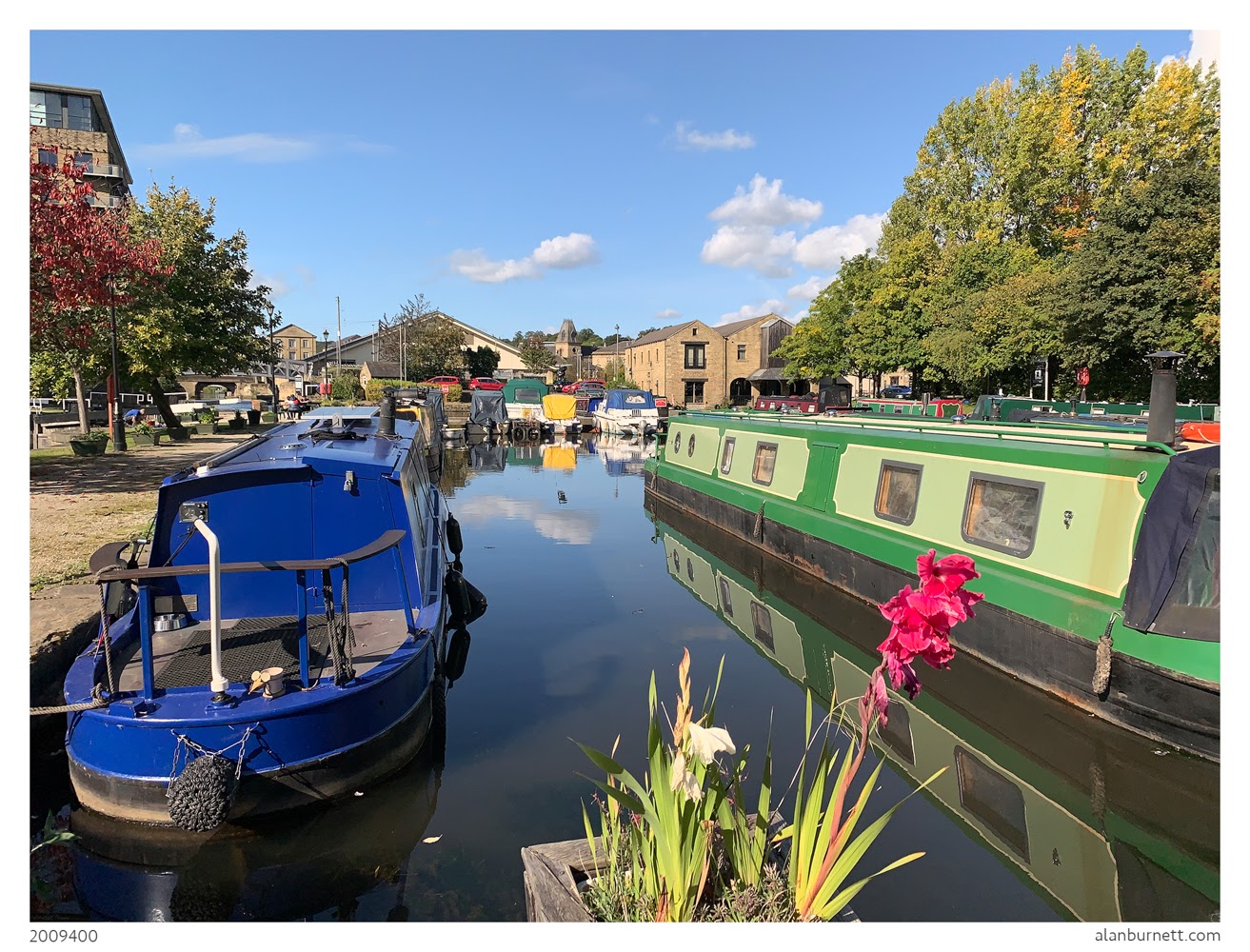 The canal basin was looking glorious in the sunshine. A few late flowers added to the colour provided by the moored barges, whilst the leaves on the trees were taking their cue from the stone-browns of the old mills and warehouses. Old fools such as me, spend too much of our lives complaining about all that has been lost, without acknowledging the positive aspects of planning and architectural developments over the last half century. The Brighouse Basin of my youth was a sad and forgotten place, as lacking in colour as the monochrome prints of it that survive.