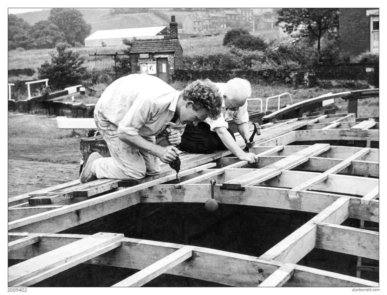 By chance, one such print worked its way to the top of my scanning pile yesterday. I think the photograph was taken in the basin, and I think I was the photographer, and I suspect that it may have been sometime around 1967. My brother – who is pictured along with my father woking on the conversion to his boat Brookfoot – will no doubt read this post on his far-off Caribbean island and correct me on the dates and locations as necessary. He won’t be able to correct the description because it is written on the back of the print in his own hand, and it reads as follows: “Fixing the longitudinal members in position with “Gripfast”. My father is also shown in this photograph lending a hand“. It seems that the photograph may have been submitted for publication as part of an article my brother was writing on his conversion of the old Yorkshire Keel barge. If that was the case, and if it was my photograph, I am obviously due some royalties, even after this lengthy period of time. You know where to send the money to, Roger!