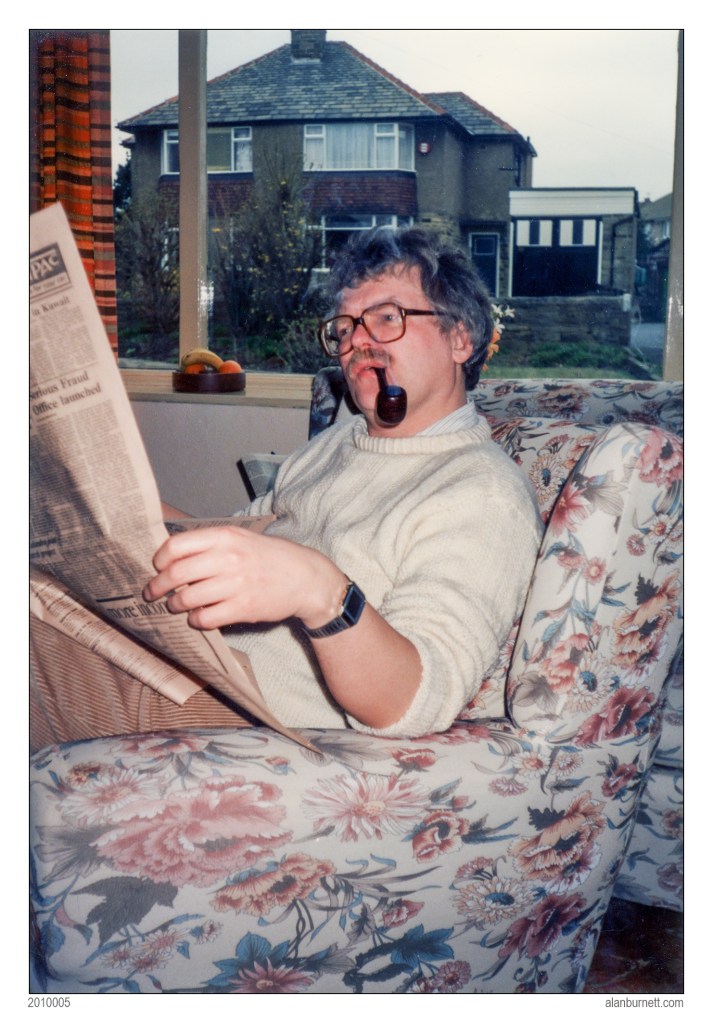Before digital time stamps were invented, you had to rely on more indirect means to date photographs. Thanks to a newspaper headline about the launch of the Serious Fraud Office, I can confidently say that this photograph of me was taken in April 1988. I seem rather relaxed, sat in one of my parent’s over-floral chairs, pipe in mouth, FT in hand, and, no doubt, my mother busy making me a mug of tea in the kitchen. This was eighteen months before the birth of Alexander: my hair has yet to turn grey and the biggest problem seems to be the state of the British economy. I was forty years old, living in Sheffield, working in Doncaster. Although my hearing had started to decline, I could still manage with a hearing aid (it will have been in my, hidden, right ear). The photograph was taken in Oaklands Avenue, Northowram – the house I grew up in. At some stage, I had captioned this image: “AB with FT” – it seems quite appropriate.