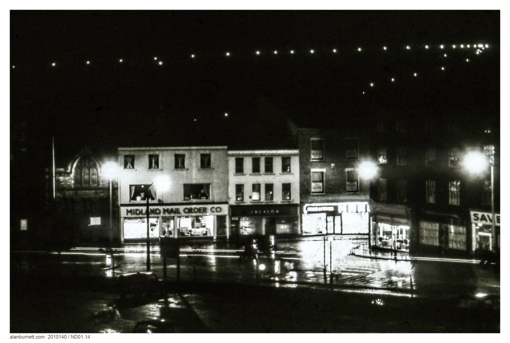 I think this is the fourth in my Halifax At Night series which must date from the late 1960s. The location is fairly easy to pin down – it is looking towards the junction of Northgate and Broad Street. You can just make out the imposing frontage of Northgate End Chapel hiding in the darkness on the left of the picture. Built in the 1870s on the site of a seventeenth century chapel, it was eventually closed in the late 1970s and demolished a couple of years later to make way for the new Bus Station. All the other brightly lit shops you can see in the photograph have also gone. I suspect I must have taken the photograph from the car park on top of Halifax Bowl. For me, the most intriguing aspect of the photo is the pattern of lights in the background which, I assume, are Beacon Hill Road and Southowram Bank.