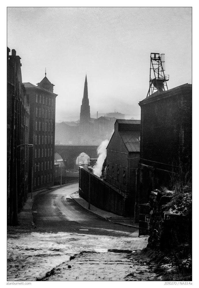 Looking through my negative archives, certain scenes keep recurring. One is this view of Bank Bottom in Halifax. I have photographs of it in rain and shine, with or without added bursts of industrial steam. At times the background of mill chimneys and church spires stand out like a fist of sore thumbs, at other times they fade into a misty backdrop. I must have taken this picture just over fifty years ago. That is, I think, ice clinging to the cobbles at the bottom of Southowram Bank. That is the mill I occasionally worked in on the left. Those are the railway arches which have an almost cathedral like feel to them. This is the Halifax of my youth.
