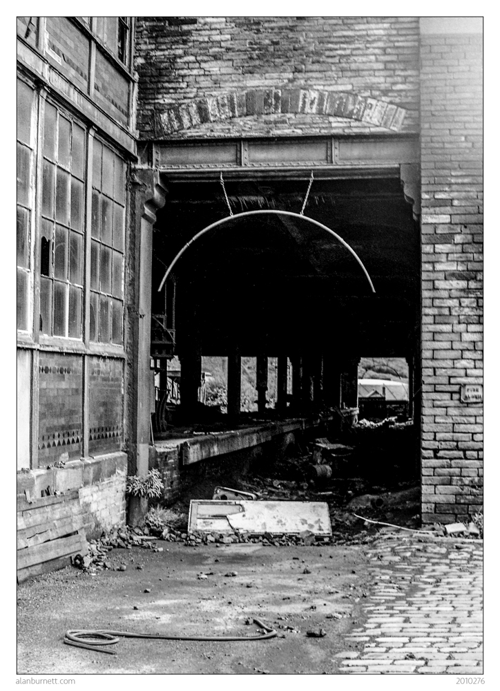 North Bridge, Halifax used to have two stations: a passenger railway station on one side, and a goods station on the other. The goods station, which stood where North Bridge Leisure Centre was later built, was closed in 1960, but the buildings remained – in a somewhat dilapidated state – for a further fifteen or twenty years. I must have taken this photograph of one of the sheds in around 1969. There is no doubt a name for that semi-circular frame hanging from the cross-beam, and, no doubt, it had a purpose (someone is bound to write-in and tell me). All I know is that it made a good composition.