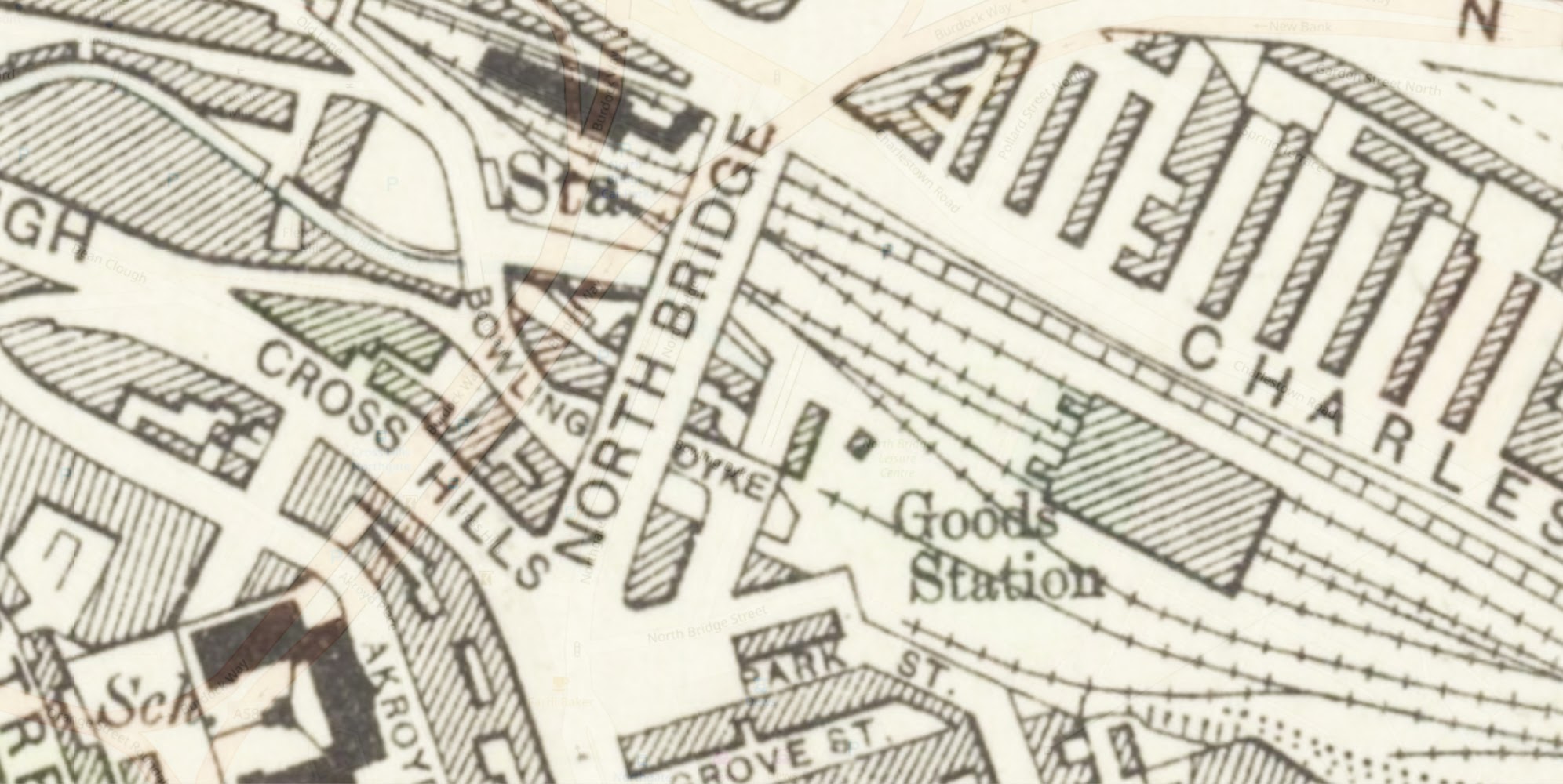 My money is on North Bridge looking SE – looking through the shed I think you can see a gas holder from the works on Charlestown Road. The semi-circular thing is a loading gauge to make sure goods on open wagons wouldn’t hit anything.