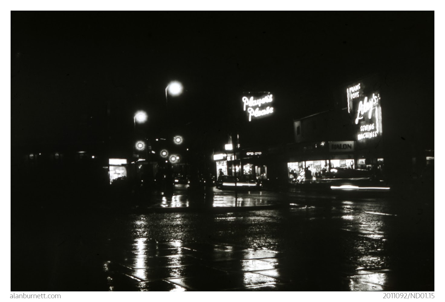 This is a photograph of George Square in Halifax, taken – as far as I can remember – in the mid 1960s. You don’t get to see much, just a few neon signs and fuzzy shop windows, but you don’t need to see much to spark a memory. This is Halifax’s answer to Times Square or Piccadilly Circus: a tobacconist and a pram shop. You might not be able to hear it, but there is a soundtrack playing in the background to this picture: something suitably smokey and jazzy. The rain is falling, and you are on your way home from the pictures; heading for the bus stop hoping to make the last bus home. Neon memories.
