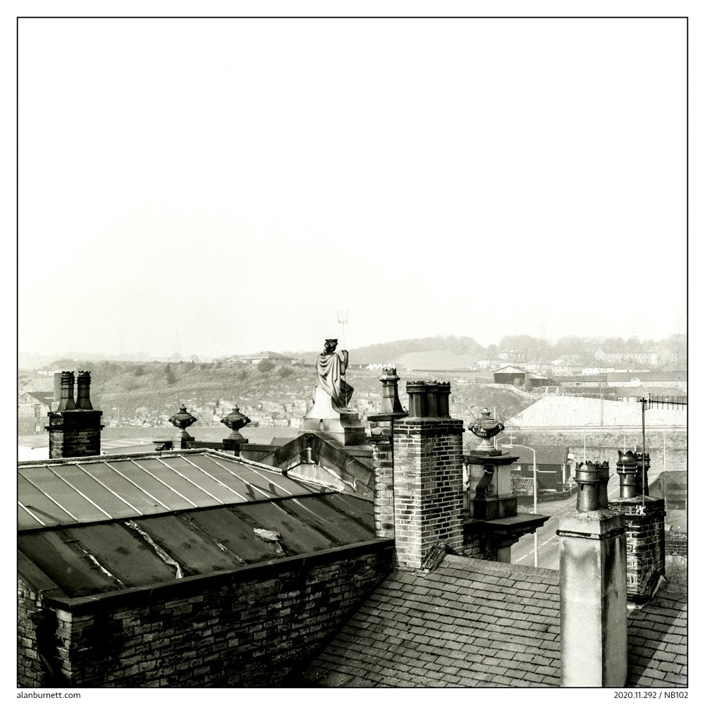 There are some scenes I return to again and again: photographs I have been taking for fifty years. One such is the statue of Britannia which overlooks Elland Bridge from her elevated position on the roof of the former premises of the Halifax and Huddersfield Banking Company. Sometimes I try and capture her in an elegant pose, flanked by the pilasters, columns and pediments of the frontage of what is now a beautifully restored building. At other times I sneak up on her and catch her off guard, amid the roof tiles and chimney pots.