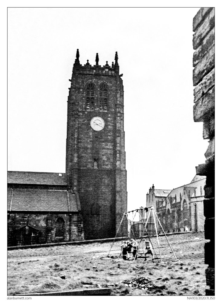 The photograph is of Halifax Parish Church (now the Halifax Minster) as seen from King Street. If you took a similar photograph today, your view of the church would be obscured by some neatly laid out grassland, the repositioned Halifax War Memorial, abundant trees and shrubs; not to mention a couple of asphalt car parks. Back in the mid 1960s, the only thing standing between you and the church would have been a pile of rubble and a set of swings. This was Halifax in the Swinging Sixties.